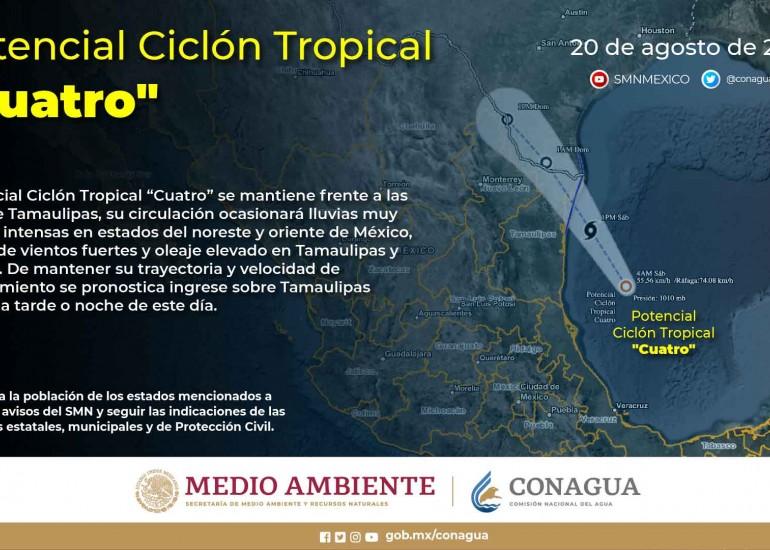 El Potencial Ciclón Tropical Cuatro, se acerca a costas nacionales, de acuerdo al aviso meteorológico 064-22, emitido por la Comisión Nacional del Agua (CONAGUA), a las 13:00 horas, tiempo del centro de México, el meteoro se localizó aproximadamente a 85 kilómetros (km) al este de Boca de Catán, Tamaulipas, y a 205 km al sur-sureste de la desembocadura del Río Grande (frontera de México con Estados Unidos de América). Tiene vientos máximos sostenidos de 55 kilómetros por hora (km/h), rachas de 75 km/h y desplazamiento hacia el noroeste a 20 km/h. Se prevé que el sistema ingrese a tierra durante la tarde o noche de este sábado.