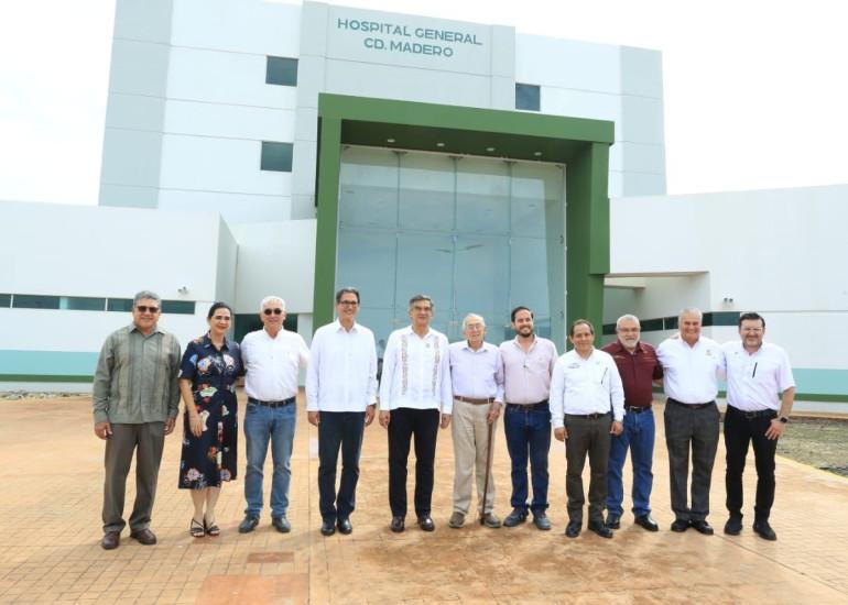 En el recorrido del nuevo hospital y en la conferencia de prensa acompañaron al gobernador: Vicente Joel Hernández Navarro, secretario de Salud; Marggid Rodríguez Avendaño, coordinador del IMSS-Bienestar en Tamaulipas; Mónica Villarreal Anaya, presidenta municipal de Tampico; Erasmo González Robledo, presidente de Madero, y Armando Martínez, presidente municipal de Altamira.