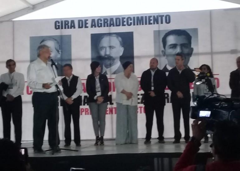 Frente a la Laguna del Carpintero, Andrés Manuel López Obrador, encabezó la tarde de este miércoles un acto masivo en el contexto de su gira de agradecimiento, en donde pese a la pertináz lluvia, un poco mas de ocho mil seguidores mostraron el ánimo y empatía que les mueve a seguir apoyandolo en su proyecto.