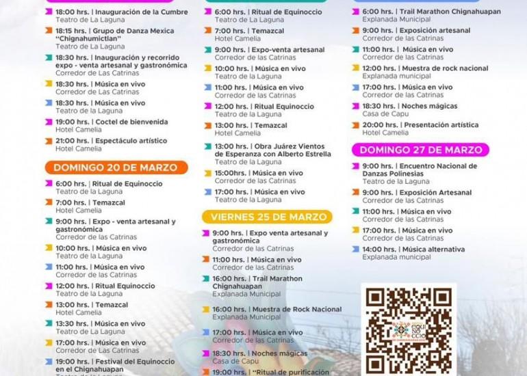 Durante los fines de semana del 19 al 21 de marzo y del 25 al 27 de marzo 2022, el municipio, Chignahuapan, Puebla, ubicado en la serranía del Estado, prepara el Primer Festival Equinoccio 2022 que contempla música en vivo, rituales de bienvenida a la primavera, exposiciones e intervenciones lumínicas en el espacio público de video mapping.