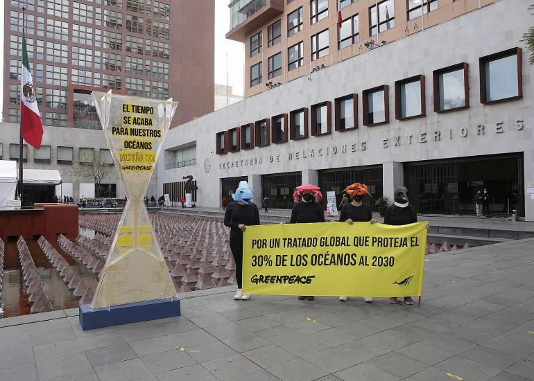 Con un reloj gigante y la advertencia ““El tiempo se acaba para nuestros océanos. Actúa ya”, en las instalaciones de la Secretaria de Relaciones Exteriores (SRE), Greenpeace México pide al Canciller Marcelo Ebrard Casaubón a actuar con determinación y asumir el liderazgo de América Latina en la Cuarta Conferencia Intergubernamental (IGC4) a favor de proteger el 30 por ciento de los océanos para el 2030.