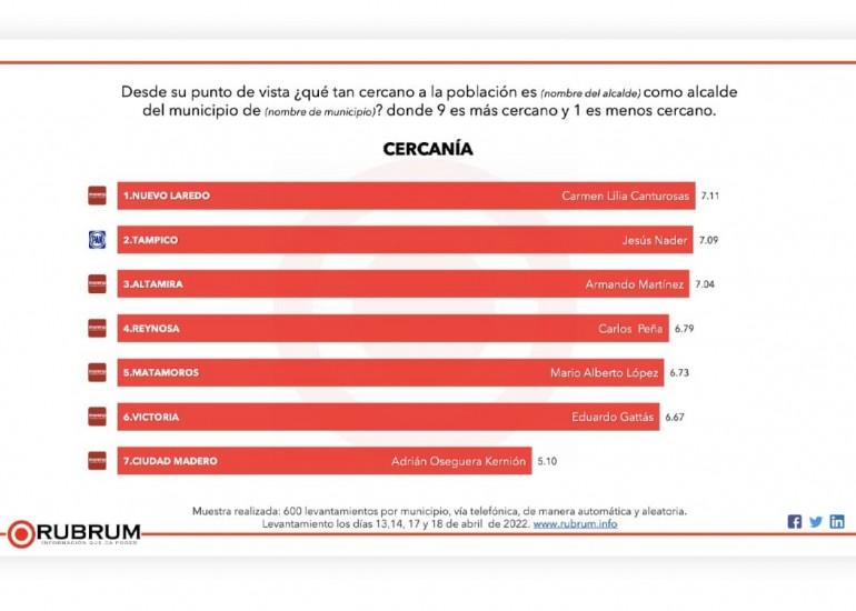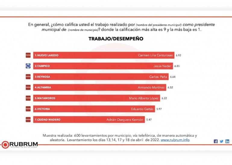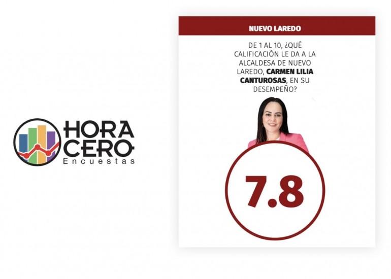 De acuerdo con la encuesta de Hora Cero, los neolaredenses calificaron el desempeño del gobierno de Canturosas con un promedio de 7.8, un porcentaje de aprobación alto.Por otro lado, en una medición sobre el desempeño de los alcaldes tamaulipecos, Rubrum posiciona a la presidenta municipal de Nuevo Laredo en primer lugar con un promedio del 6.92.
