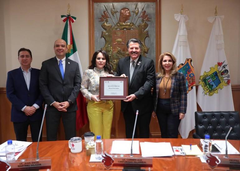 En reconocimiento a las acciones emprendidas para fortalecer la relación entre los Dos Laredos, la alcaldesa Carmen Lilia Canturosas Villarreal entregó un reconocimiento a su homólogo de Laredo, Texas, el mayor Pete Saenz.