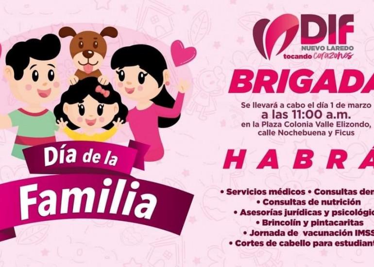 El Sistema para el Desarrollo Integral de la Familia (DIF) de Nuevo Laredo invita a la ciudadanía su Brigada por el Día de la Familia, que se llevará a cabo este miércoles 1 de marzo en la colonia Valle Elizondo, dentro de la plaza ubicada en calle Nochebuena y Ficus a partir de las 11:00 de la mañana.
