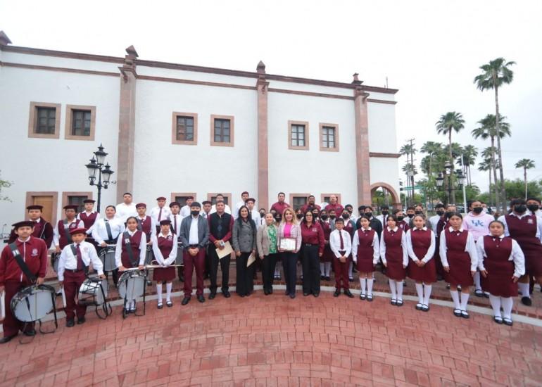 El reconocimiento lo entregaron la directora de la Institución Educativa, Xóchitl Naranjo Martínez y el alumno Aldo Castañeda Sánchez a la segunda síndica, Imelda Mangín Torre en representación de la presidenta municipal.