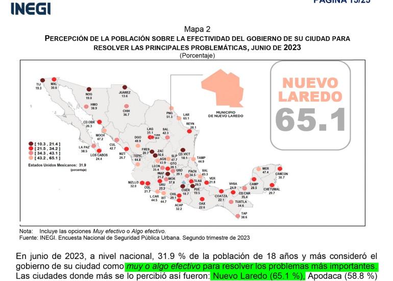 El gobierno de Nuevo Laredo se posiciona como el más eficiente de México para resolver la problemática urbana que aqueja a la población de acuerdo con la Encuesta Nacional de Seguridad Pública Urbana (ENSU) del Instituto Nacional de Estadística y Geografía (INEGI) publicada en este segundo trimestre del 2023.