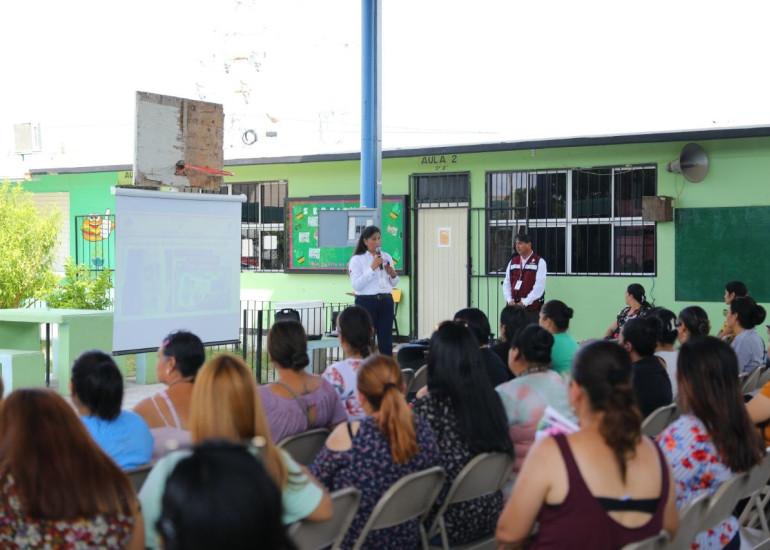 Personal de Tránsito y Vialidad brindó pláticas de educación vial a padres de familia y docentes de la primaria Arquímedes Caballero para que exista una mejor circulación y evitar accidentes en el ascenso y descenso de los alumnos.
