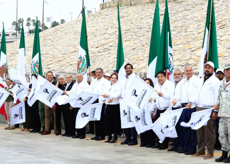 El gobernador Américo Villarreal Anaya y el comisionado del Instituto Nacional de Migración, Francisco Garduño Yáñez, dieron el banderazo de inicio al Operativo Especial de Invierno 2023 del Programa Héroes Paisanos, evento en el cual el mandatario estatal aseguró que el Gobierno de Tamaulipas está listo para brindar atención, servicio y garantizar el respeto a los derechos de los connacionales que arriban a México y transitan por el estado, en este periodo de fin de año.