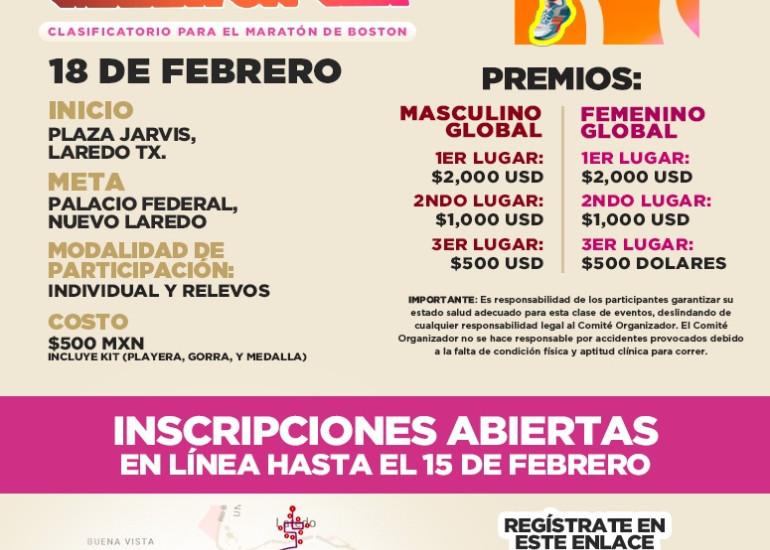 Este Maratón Binacional Dos Laredos se llevará a cabo el 18 de febrero y tendrá como punto de inicio la Plaza Jarvis en Laredo, mientras que la meta será en el Palacio Federal de Nuevo Laredo.