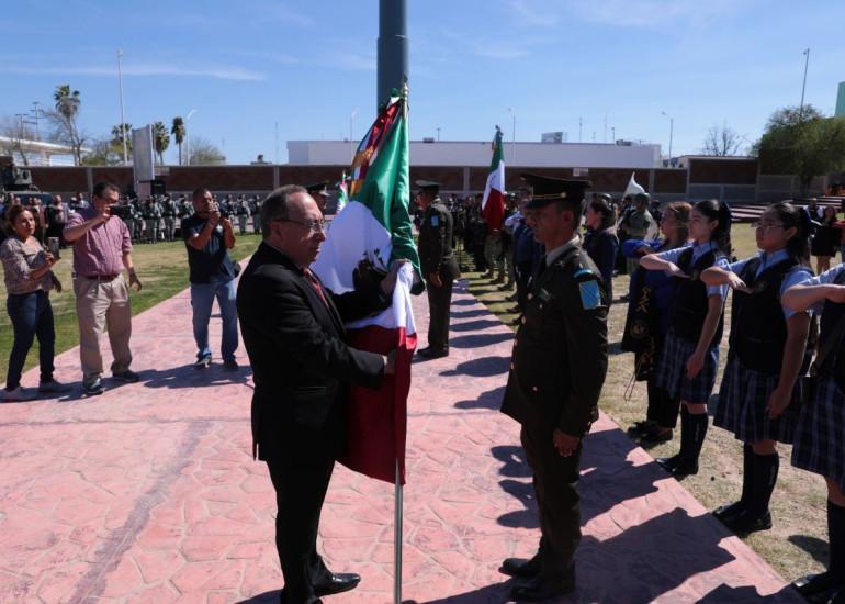 En conmemoración de uno de los símbolos patrios más importantes del país, autoridades de los tres niveles de gobierno, militares, consulares e instituciones educativas, se dieron cita en el parque Morelos para celebrar el Día de la Bandera.