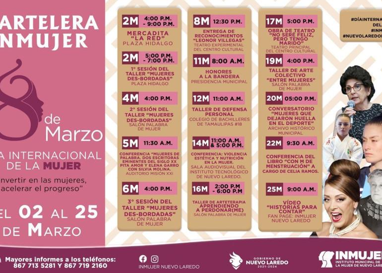 El Instituto Municipal de la Mujer (INMUJER) lleva a cabo diversas actividades con motivo del Día Internacional de la Mujer que se conmemoró el 8 de marzo. Por tal motivo el Inmujer lanzó una cartelera con actividades como talleres, conferencias, obras de teatro entre otras.