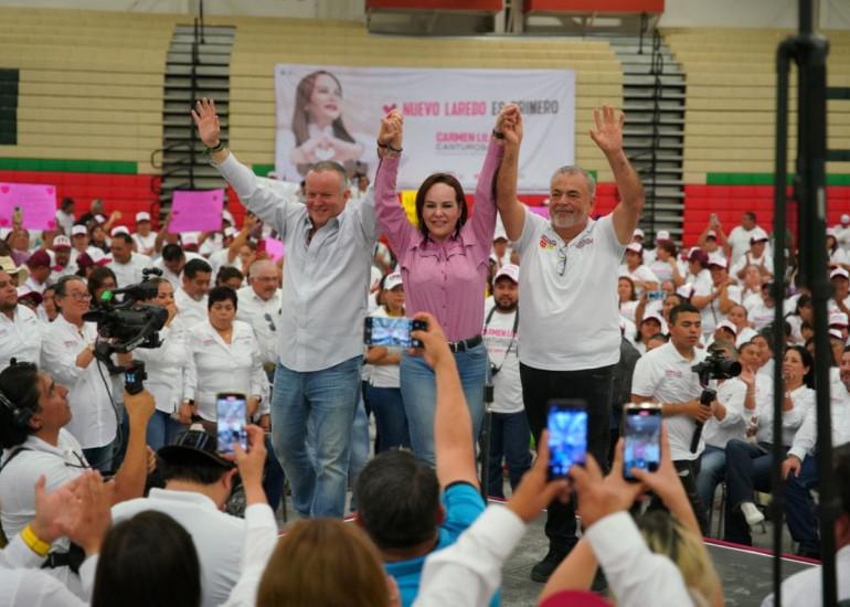 En medio de porras, aplausos y un ensordecedor grito en coro de “‘¡presidenta, presidenta, presidenta!”Carmen Lilia Canturosas Villarreal, candidata de la coalición Morena, PT y Verde Ecologista, inició su campaña en busca de la reelección como alcaldesa de Nuevo Laredo.Ante más de 2 mil familias y con un emotivo mensaje, reiteró su compromiso de continuar trabajando por el bienestar y progreso de todos los que viven en esta frontera y defender lo que juntos han avanzado para llevar a la ciudad al más alto nivel.La candidata de la coalición