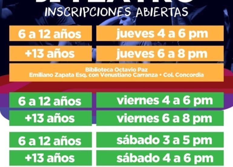 El Gobierno Municipal, a través de la Dirección de Arte y Cultura invita a las niñas, niños y jóvenes que deseen aprender habilidades teatrales, a inscribirse en el Taller de Teatro gratuito que se estará llevando a cabo en las instalaciones de la Biblioteca “Octavio Paz”.