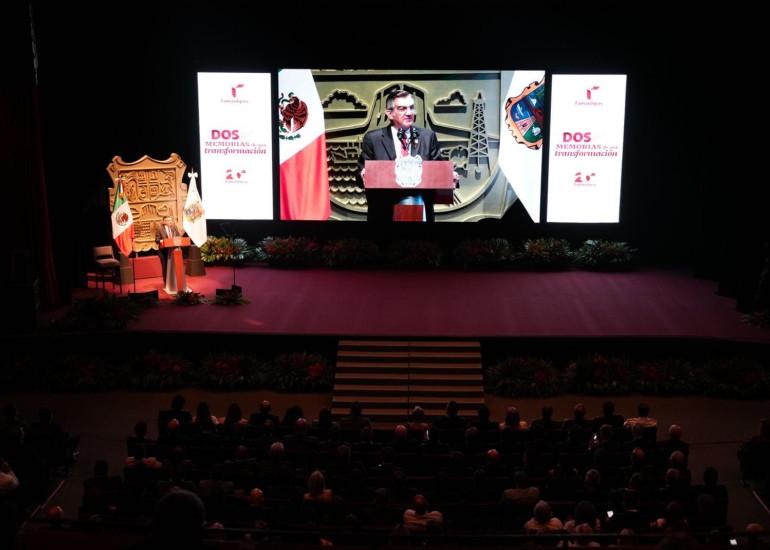 En una ceremonia cargada de emotividad, el gobernador Américo Villarreal Anaya, encabezó el conversatorio “Dos Años de Memorias de una Transformación”, en el cual rindió un informe detallado sobre su trabajo humanista en lo que va de su gobierno.