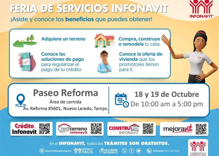 Nuevo Laredo, Tamaulipas, a 16 de octubre de 2024.- El Instituto del Fondo Nacional de la Vivienda para los Trabajadores (Infonavit) realizará una Feria de Servicios en Nuevo Laredo, Tamaulipas, con el objetivo de acercar sus diferentes trámites y servicios a las y los derechohabientes en el estado.