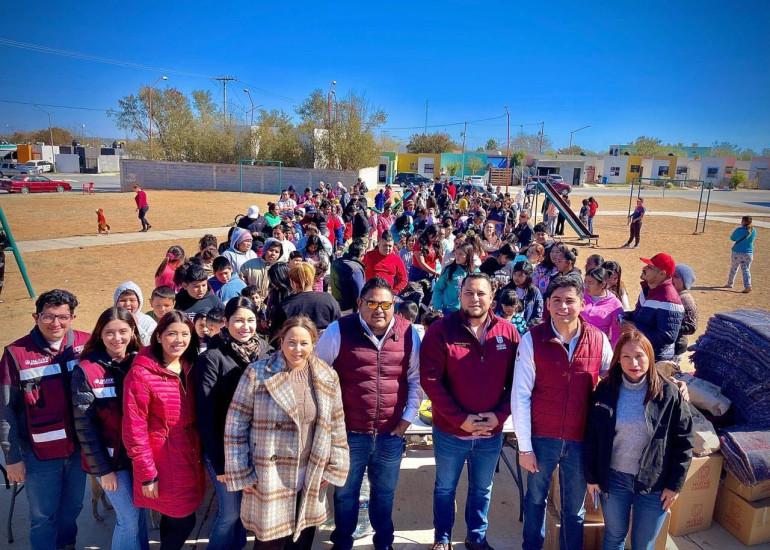 Alrededor de 300 personas se reunieron en la plaza principal de esa colonia; recibieron cobijas, despensas; mientras que a los niños se les entregó juguetes.