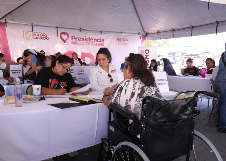 Dentro de la mega brigada, Claudette Canturosas Villarreal, presidenta del Sistema DIF, llevó a una audiencia con vecinos del sector y entregó silla de ruedas, canalizó a ciudadanos para atención médica especializada, entre otros apoyos.
