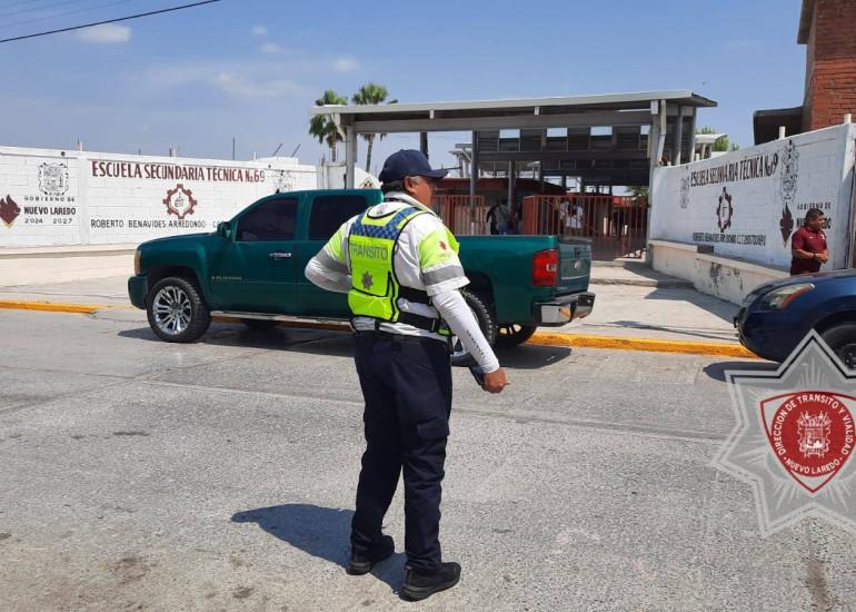 Con el objetivo de salvaguardar la integridad de los menores y mantener el orden vehicular en los alrededores de los planteles educativos, la Dirección de Tránsito y Vialidad de Nuevo Laredo implementa diariamente operativos de vigilancia y control durante los horarios de entrada y salida en escuelas primarias de la ciudad.