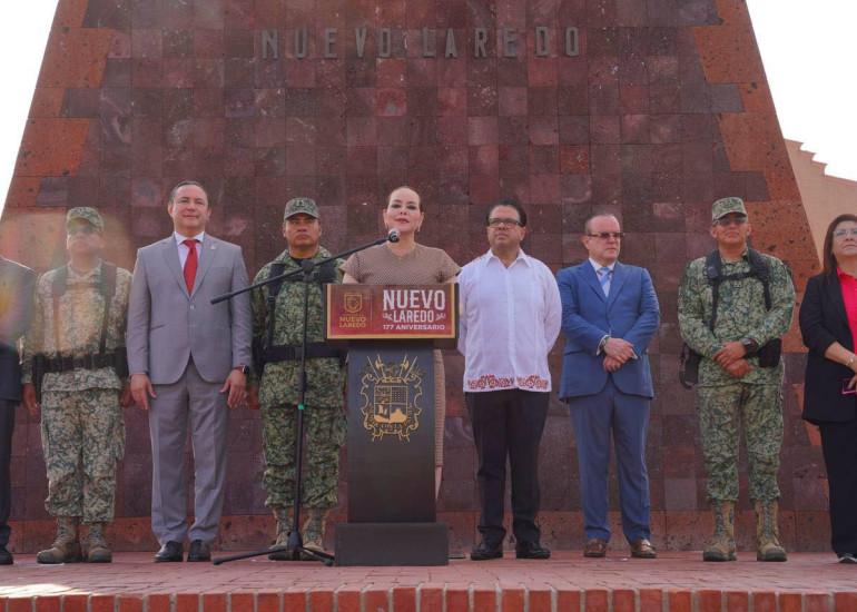 En el marco del 177 aniversario de la fundación de Nuevo Laredo, la presidenta municipal Carmen Lilia Canturosas Villarreal, acompañada de autoridades militares, federales, estatales y municipales, encabezó los honores al lábaro patrio rindiendo tributo a los orígenes y la identidad de esta ciudad fronteriza.