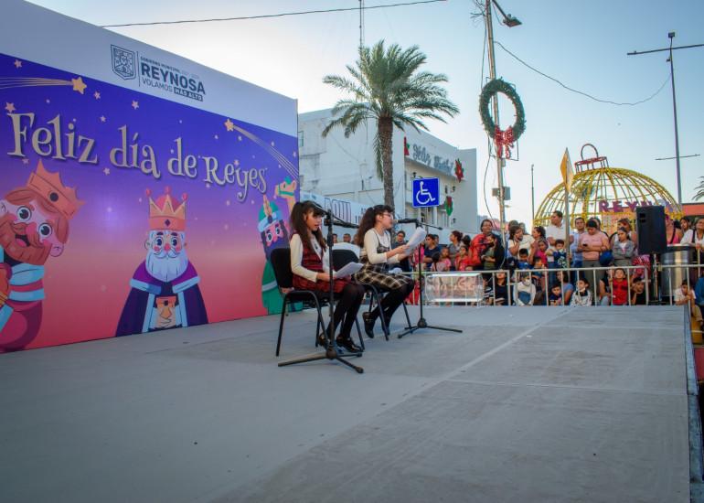 El Gobierno de Reynosa, encabezado por el Alcalde Carlos Peña Ortiz, organizó un evento familiar para conmemorar el Día de Reyes en nuestra ciudad y dar cierre a las festividades navideñas. El Instituto Reynosense para la Cultura y las Artes participó de manera especial, presentando un programa artístico a cargo de los alumnos de los talleres de teatro y música.