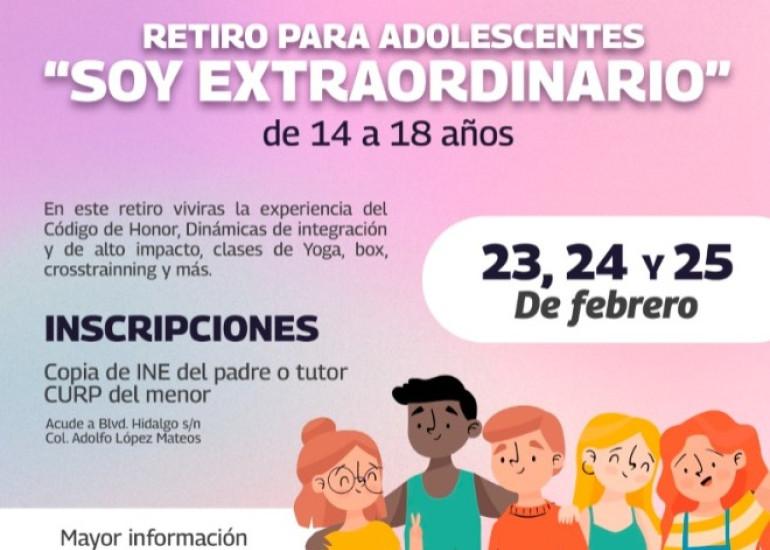 El Gobierno de Reynosa que encabeza el Alcalde Carlos Peña Ortiz, a través del Sistema DIF Reynosa que preside Carlos Luis Peña Garza, invita a ser parte del Retiro “Soy Extraordinario”, que busca atender la salud mental de los menores de edad y jóvenes.