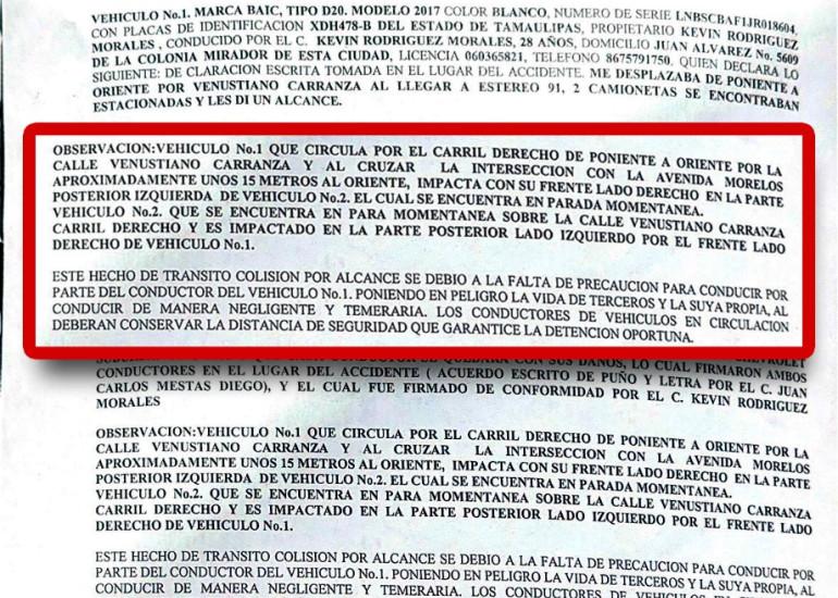 La declaración oficial del conductor demandante, ante las autoridades, confirma que él asumió la responsabilidad del accidente. Según el informe oficial de la policía de tránsito de Nuevo Laredo, Tamaulipas, el accidente fue causado por la falta de precaución del conductor del vehículo del demandante, quien chocó con el vehículo No. 2, que se encontraba detenido momentáneamente en el carril derecho (Se adjunta peritaje).