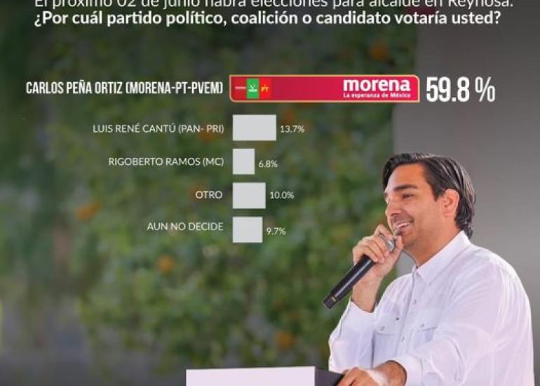 El candidato de la coalición MORENA-PT-PVEM a la presidencia municipal, Carlos Peña Ortiz domina la escena electoral de Reynosa, al recibir un determinante apoyo del 59.8% de preferencia electoral, de acuerdo a la opinión ciudadana, revelada en un ejercicio de consulta este 21 de marzo.