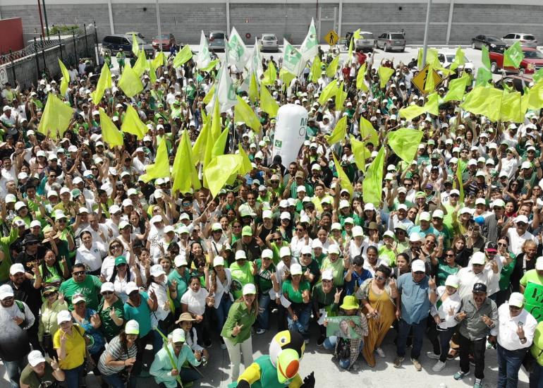 Miles de automovilistas circularon por la avenida Ciruelos y libramiento a Monterrey en Jarachina, con su claxon y aceptando una calcomanía o un microperforado en su cristal trasero ya son seguidores del Partido Verde y de sus candidatos Maki y "Geño", quienes están impulsando el proyecto de la candidata presidencial para lograr la mayoría calificada en la Cámara de Senadores.