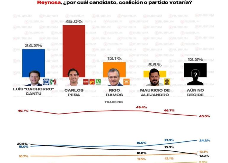 En Reynosa ya decidieron, Carlos Peña Ortiz, candidato de MORENA-PT-PARTIDO VERDE a la presidencia municipal, es líder en la intención de voto de los electores que lo perfilan como virtual ganador de la alcaldía, así lo indica la opinion ciudadana que le da el 45.0% de preferencia, un 20.8% sobre el distante segundo lugar, aspirante del PRI-PAN, que apenas logra un 24.2%.