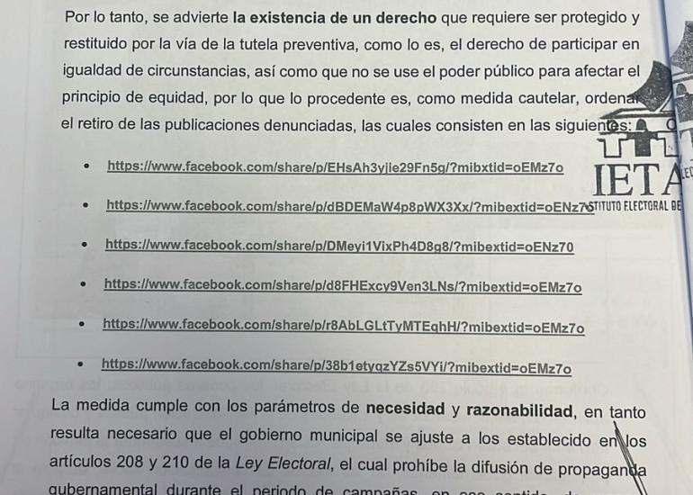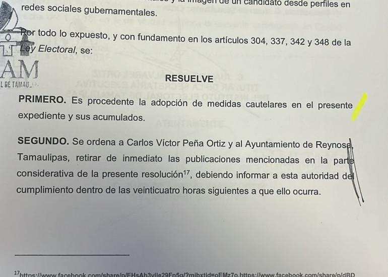 En el dictamen, y con fundamento en los artículos 304, 337, 342, y 348 de la ley electoral se resolvió ordenar a Carlos Víctor Peña Ortiz y al Ayuntamiento de Reynosa Tamaulipas, retirar de inmediato las publicaciones mencionadas en el mismo, otorgándose 24 horas para el cumplimento de dichas medidas.