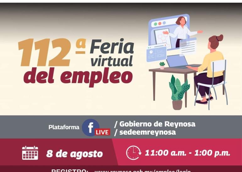 Con más de 300 plazas laboraes disponibles, el Presidente Municipal Carlos Peña Ortiz invita a la 112ª Feria Virtual de Empleo a llevarse a cabo este jueves 8 de agosto, una política pública del Gobierno de Reynosa reconocida por el
