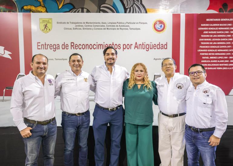 Realzando la celebración, trabajadores del Sindicato recibieron un reconocimiento por su antigüedad con hasta más de 30 años de servicio, y reconocimientos especiales para Rafael Jiménez López ex Secretario General del Sindicato de Mantenimiento y Limpieza; para el Alcalde Carlos Peña Ortiz y para Reynaldo Garza Elizondo.