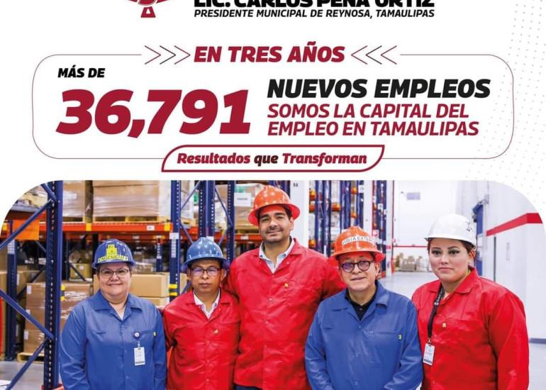 En solo 3 años, en Reynosa se han generado más de 36,791 nuevos empleos, esto consolidando a nuestro municipio como la capital del empleo en Tamaulipas. ¡Un verdadero récord! que genera bienestar para la comunidad.