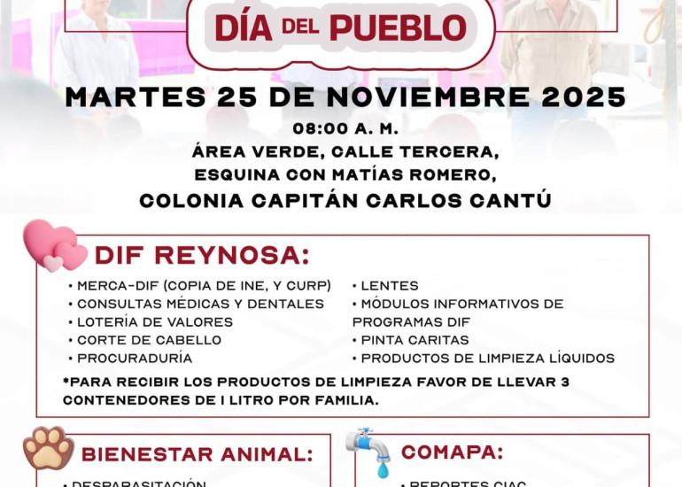 Por instrucciones del Alcalde, Carlos Peña Ortiz, el Sistema DIF-Reynosa, llevará este martes 25 de noviembre una brigada a la colonia Capitán Carlos Cantú, con el propósito de acercar servicios y ofrecer atención directa a las familias.