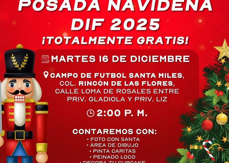 El Alcalde Carlos Peña Ortiz, a través del Sistema DIF-Reynosa invita a la Posada Navideña DIF 2025, que se realizará este martes 16 de diciembre, a partir de las 2:00 de la tarde en el campo de futbol Santa Miles, ubicado en la colonia Rincón de las Flores, sobre la calle Loma de Rosales, entre Privada Gladiola y Privada Liz, como parte de las acciones para fortalecer la convivencia familiar durante la temporada decembrina.