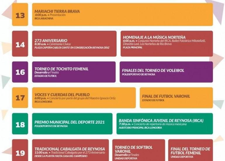 Con esto el Ayuntamiento de manera oficial da inicio a una serie de festejos en celebración de la fundación de Reynosa, donde se contempla una agenda de actividades artísticas, deportivas y culturales.Es así como la convocatoria se extiende a los reynosenses para conmemorar y participar en este 273 aniversario.