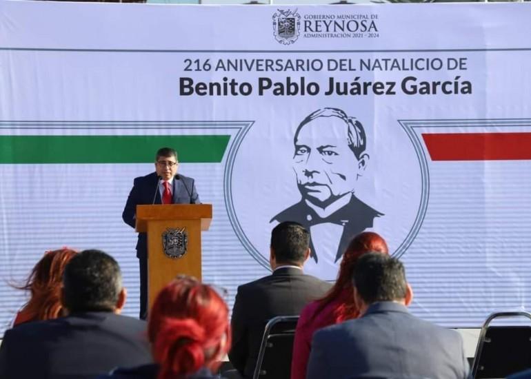 En la ceremonia se cumplieron los rigurosos Honores a la Bandera y entonación del Himno Nacional, con la presencia de autoridades civiles y militares, en la explanada de la plaza principal.En el marco de esta celebración la joven Denisse Yamileth Castaño Juárez, expresó: “ Juárez es ejemplo para los niños y aliento para los jóvenes que reclaman lugares de combate y que se identifican con los esfuerzos que los mexicanos realizan para progresar “.