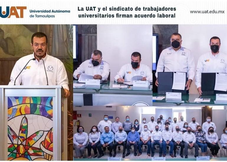 El Rector de la Universidad Autónoma de Tamaulipas (UAT), C. P. Guillermo Mendoza Cavazos, presidió la firma del Contrato Colectivo Laboral 2022, que establece el incremento salarial con retroactivo al mes de enero de este año.