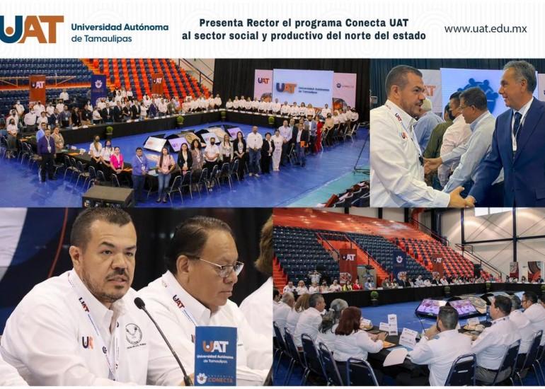 El Rector de la Universidad Autónoma de Tamaulipas, Guillermo Mendoza Cavazos, presentó en el Gimnasio Multidisciplinario de Reynosa la Gira Conecta UAT, ante representantes de los sectores productivos y sociales de municipios de la zona norte del estado.