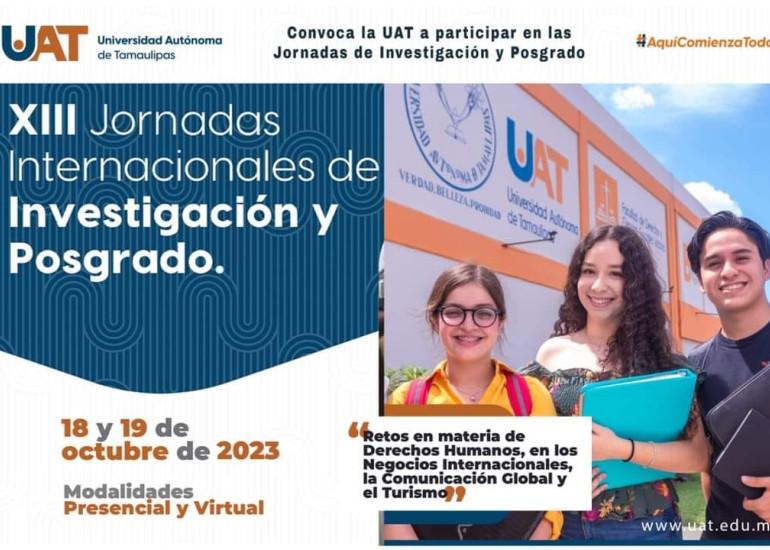 La Facultad de Derecho y Ciencias Sociales Victoria (FDCSV) de la Universidad Autónoma de Tamaulipas (UAT) invita a participar en las XIII Jornadas Nacionales de Investigación y Posgrado denominadas "Retos en materia de derechos humanos en los negocios internacionales, comunicación global y turismo", que se realizarán de manera presencial y virtual los días 18 y 19 de octubre de 2023. Según la convocatoria vigente, la fecha límite para la entrega de resúmenes es el 11 de agosto y la recepción de ponencias en extenso vence el viernes 15 de septiembre.
