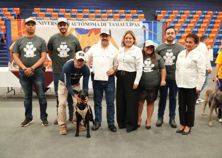 En emotiva ceremonia, el rector de la Universidad Autónoma de Tamaulipas (UAT), MVZ Dámaso Anaya Alvarado, presidió la entrega en adopción de diez perros retirados de corporaciones de seguridad y auxilio, a familias tamaulipecas que les brindarán los cuidados y la atención que merecen.