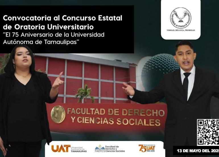 La Universidad Autónoma deTamaulipas (UAT) celebrará, el próximo 13 de mayo, el Concurso Estatal de Oratoria Universitario, organizado por la Facultad de Derecho y Ciencias Sociales del Campus Tampico (FADYCS) con motivo de celebrar el 75 aniversario de la fundación de la máxima casa de estudios del estado.