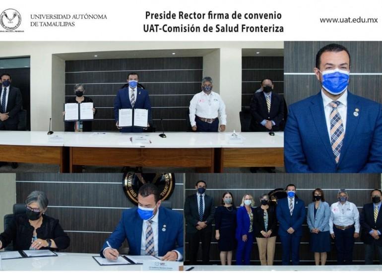La Universidad Autónoma de Tamaulipas (UAT) y la Comisión de Salud Fronteriza México-Estados Unidos formalizaron mediante la firma del convenio marco de colaboración el acuerdo por contribuir en la formación humana y profesional, el intercambio académico y el desarrollo de proyectos científicos y tecnológicos.