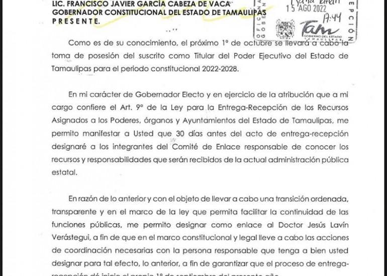 “En mi carácter de Gobernador Electo y en ejercicio de la atribución que a mi cargo confiere el artículo 9 de la Ley para la entrega-recepción de los recursos asignados a los Poderes, Órganos y Ayuntamientos del Estado de Tamaulipas, me permito manifestar a Usted que 30 días antes del acto designaré a los integrantes del Comité de Enlace responsable de conocer los recursos y responsabilidades que serán recibidos de la actual administración pública estatal”, indica el oficio que fue recibido esta tarde en la Oficina del Gobernador Francisco García Cabeza de Vaca.