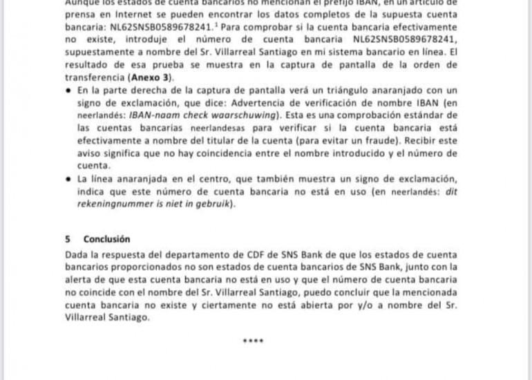 “Aquí está la respuesta que finalmente se tardó en poderse hacer porque tuvimos que conseguir un Notario Público especializado en Holanda, en los Países Bajos, para desmentir el dicho de la cuenta de banco de mi hijo Humberto Francisco Villarreal Santiago en este banco holandés y aquí está la respuesta”, dijo.