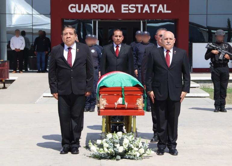 Tras un minuto de silencio, una salva de honor y el toque de silencio interpretado por la Banda de Guerra de la Guardia Estatal, se procedió al cortejo fúnebre para acompañar al elemento fallecido en funciones de alto impacto, asimismo, el titular de la SSPT refrendó el compromiso de la actual administración de no desamparar a sus familiares.