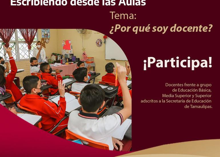 La Secretaría de Educación de Tamaulipas anuncia la primera edición del concurso literario “Escribiendo desde las aulas” con el tema: ¿Por qué soy docente?, que tiene como objetivo revalorizar a las maestras y maestros, promoviendo mejores condiciones para su desarrollo integral en las prácticas docentes.