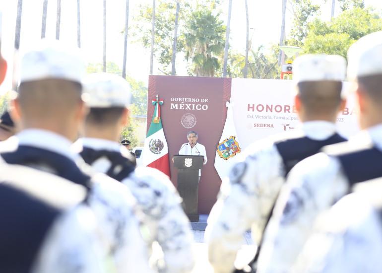 “Que tanto las fuerzas de seguridad como los servidores públicos trabajemos en conjunto, con ahínco, sin descanso, con todo nuestro esfuerzo y tenacidad para lograr estos grandes cambios que trasciendan a nuestra nación”, dijo el gobernador de Tamaulipas al presidir este lunes, la ceremonia cívica de honores ante la presencia de elementos militares, de la Guardia Nacional y servidores públicos del gobierno del Estado.