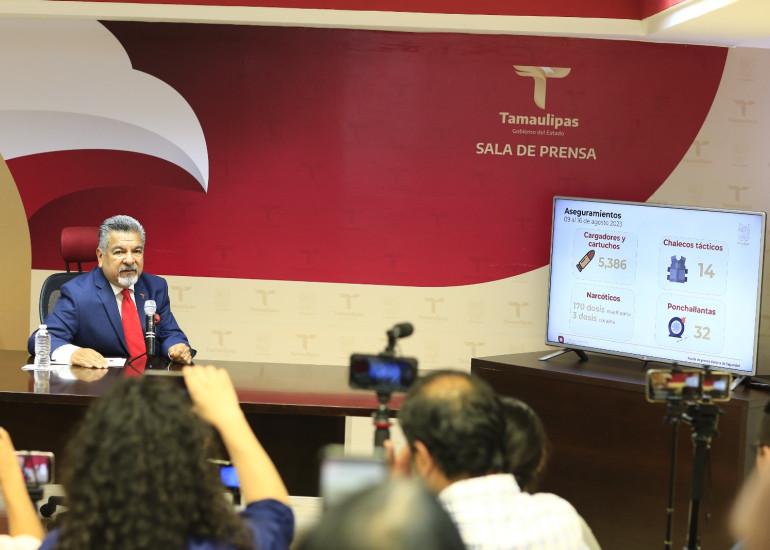 Respecto a los aseguramientos realizados la semana anterior, informó que hubo 18 detenidos, 42 vehículos asegurados, 36 armas de fuego y 7 vehículos blindados, además de 5 mil 386 cartuchos y cargadores, 14 chalecos tácticos y 32 poncha llantas.