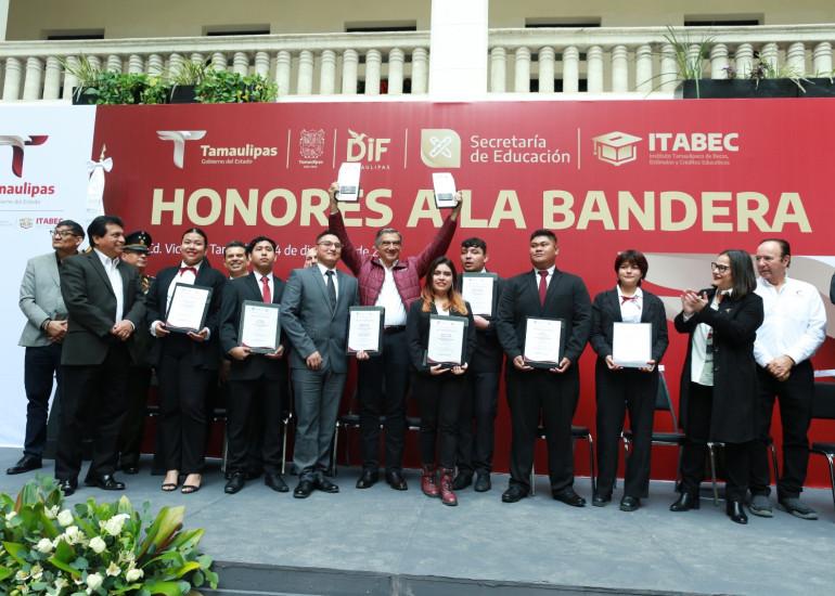 Durante la ceremonia cívica de honores, celebrada este lunes en el patio central de Palacio de Gobierno, el mandatario tamaulipeco otorgó becas y reconoció a los alumnos de diferentes planteles que a lo largo del presente ciclo escolar destacaron en eventos nacionales e internacionales, además de reiterar todo su compromiso y apoyo para lograr una educación de excelencia en Tamaulipas.
